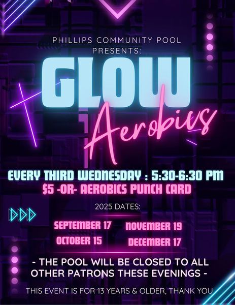 *Every 3rd Wednesday will be GLOW aerobics - these classes are for 13+years old and the pool will be closed to the public during these evenings